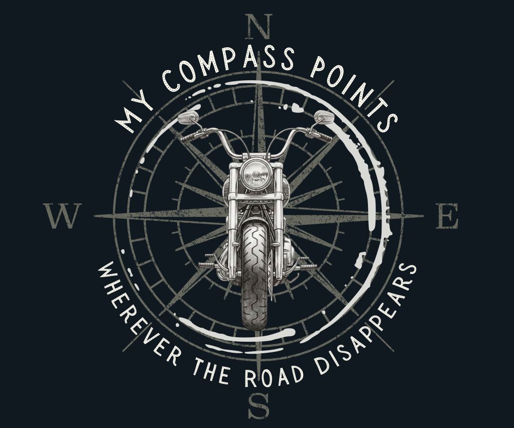 This design features a head-on motorcycle illustration integrated with a weathered compass rose. The phrase My Compass Points Wherever the Road Disappears arches around the central graphic to emphasize the spirit of adventure and discovery. The muted, vintage color palette and hand-drawn style give the piece a rugged, custom look that stands out clearly on dark apparel.