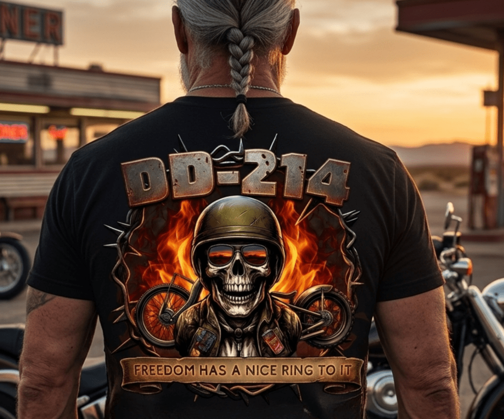 This aggressive design blends military and biker culture for a powerful, custom-feel statement piece. The central focus is a skull wearing a helmet and a leather jacket, set against roaring flames and framed by a motorcycle chain border. I used weathered metal typography for the ‘DD-214’ text to create a tough, institutional look, balanced by a lower banner featuring the phrase ‘Freedom has a nice ring to it’ in a classic, distressed script. The entire graphic is balanced to sit perfectly on a dark t-shirt, emphasizing the contrast of fire and metal.