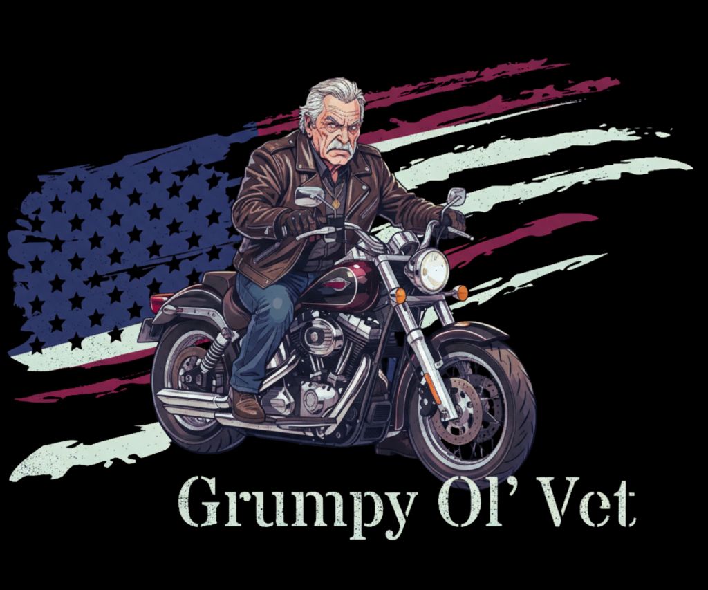This design features a detailed illustration of an older rider on a motorcycle, set against a distressed American flag backdrop to celebrate veteran identity with a touch of attitude. The character’s stern expression and leather gear establish a “grumpy” persona that resonates with the biker community. Stencil-style typography is used for the Grumpy Ol’ Vet text to create a rugged, military-inspired finish that stands out on a dark shirt.