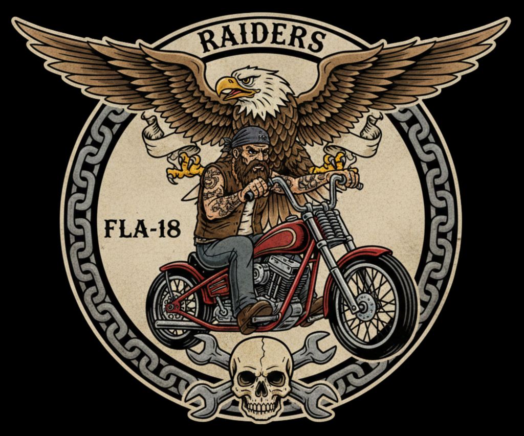 This circular emblem design features a rider and a bald eagle to create a classic custom apparel look. A motorcycle chain border, skull, and crossed wrenches frame the graphic for a rugged finish. The arched Raiders text and FLA-18 branding provide a clear identity for this specific chapter.