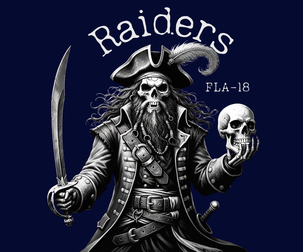 This design was created for the Raiders chapter of the US Military Veterans Motorcycle Club and features a highly detailed skeletal pirate to reflect the chapter’s specific identity. The grayscale illustration incorporates classic nautical elements like a cutlass and tricorn hat to create a rugged and formidable aesthetic. Clean white typography arches over the character while the FLA-18 branding provides a clear local connection. The high-contrast graphic is balanced to stand out sharply on dark apparel.