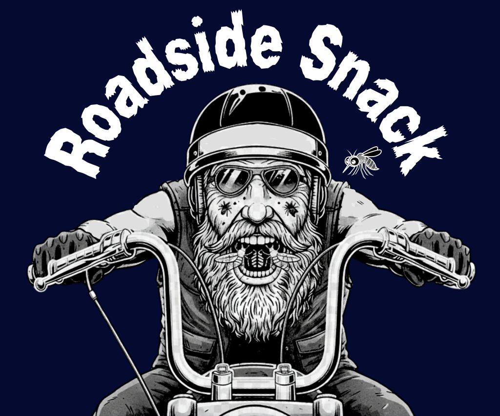 This humorous design depicts the relatable experience of riding down the highway and getting bugs in your teeth. The grayscale illustration features a gritty biker mid-ride with several insects caught in his beard and mouth for a lighthearted, comedic effect. Arched, distressed white typography and a fly icon frame the character, creating a balanced and high-contrast graphic intended for dark apparel.